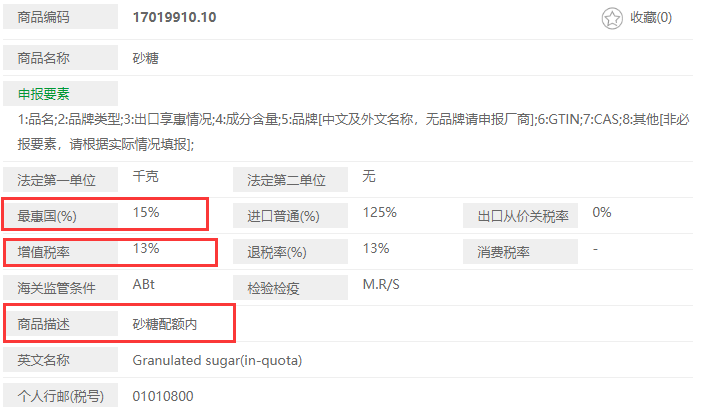 HS編碼1701991010,關稅15%,增值稅13%